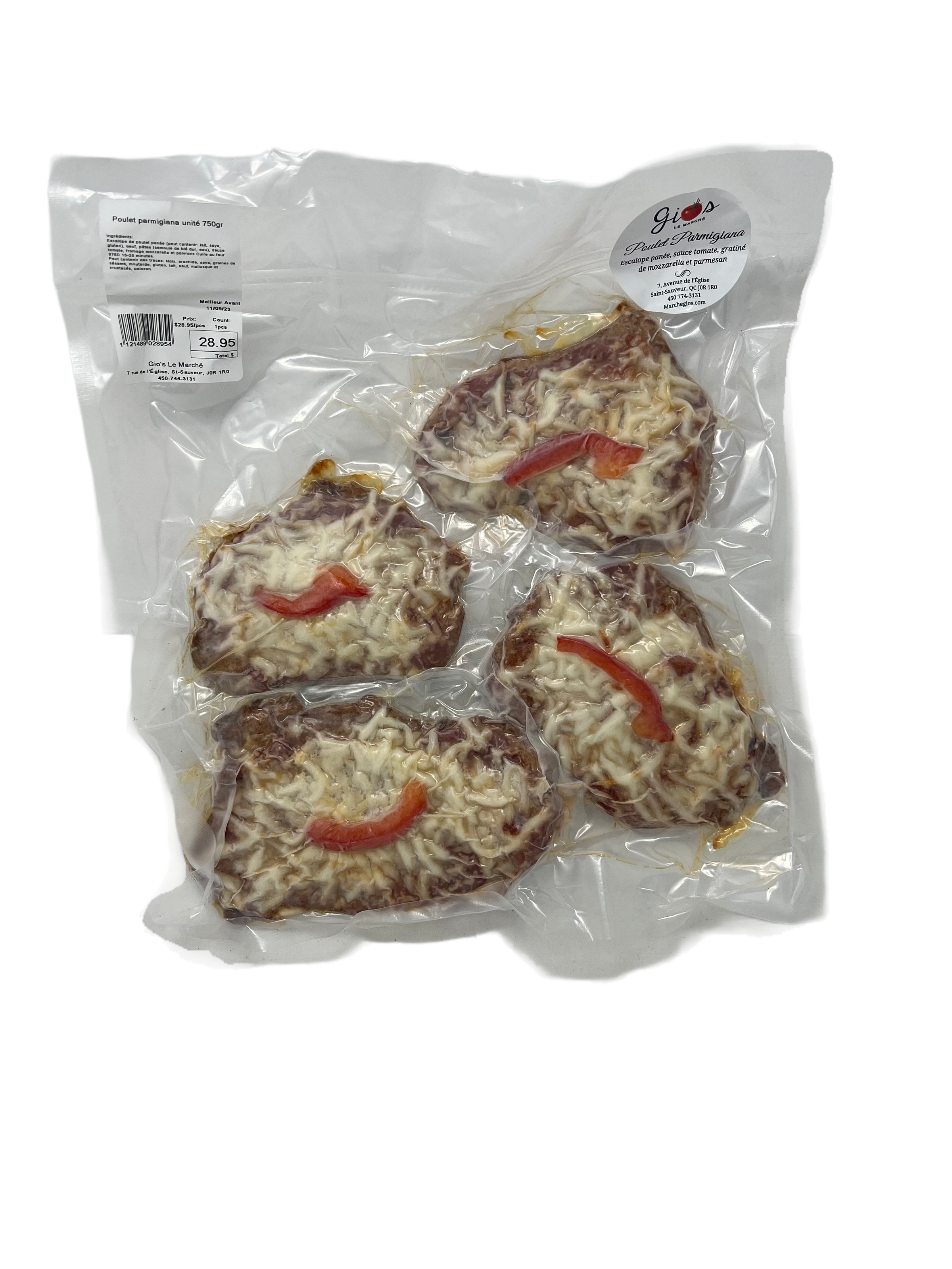 Paquets de poulet parmigiana emballés individuellement totalisant 750g.