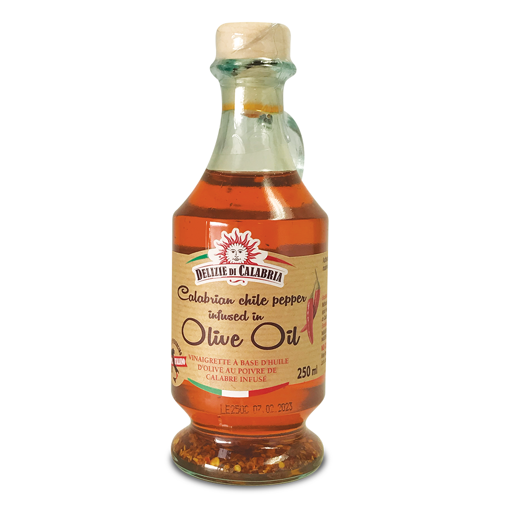 L'huile piquante Delizie di Calabria est faite avec l’infusion naturelle de piment de Calabre dans l’huile d’olive, la méthode authentique calabraise pour faire une huile épicée.