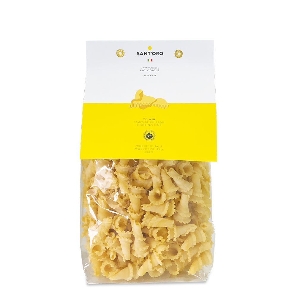 Les pâtes campanelle biologiques de Sant'oro sont probablement les pâtes que l'on vend le plus depuis notre ouverture. En plus de leur goût authentique, on les aime pour leur forme intéressante qui permet de capturer un maximum de sauce à chaque bouché.