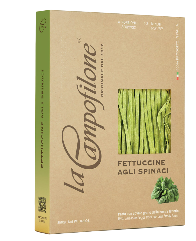 Épater vos invités avec ces pâtes colorées naturellement par les épinards. Le goût des épinards est parfaitement dosé dans ce fettuccine au œuf de La Campofilone.
