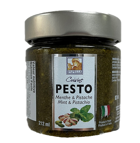 Découvrez notre pesto frais et unique à la menthe et aux pistaches, un trésor de saveurs directement importé d’Italie.