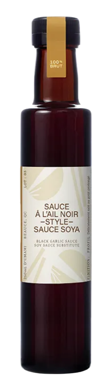 Ingrédients : Eau, Purée d’ail noir, Sirop d’érable, Sel de mer, Vinaigre de riz