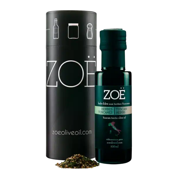 Le kit contient 1 x 100 ml d'huile d'olive extra vierge infusée aux herbes de Toscane Zoë.