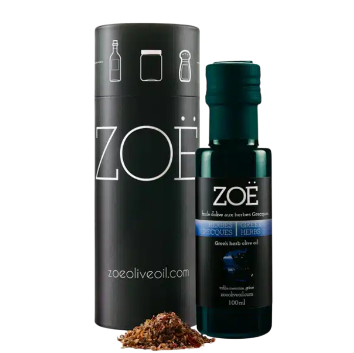Le kit contient 1 x 100 ml d'huile d'olive extra vierge infusée aux herbes grecques. Zoë