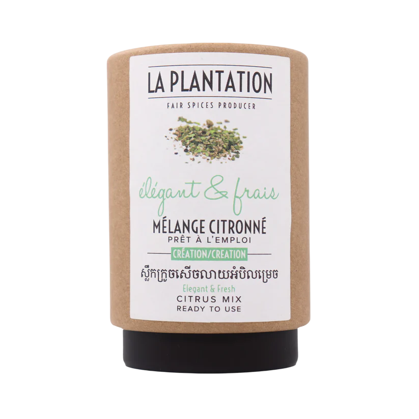 Ingrédients : Poivre noir de Kampot, fleur de sel mélangée à des feuilles de combava séchées au soleil du jardin de La Plantation.