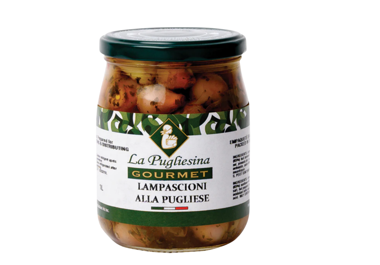 Les "Lampascioni alla Pugliese" de La Pugliesina Gourmet sont des bulbes sauvages des Pouilles (bulbes de jacinthe plumeuse ou Leopoldia comosa) conservés dans de l'huile, réputés pour leur saveur amère unique.
