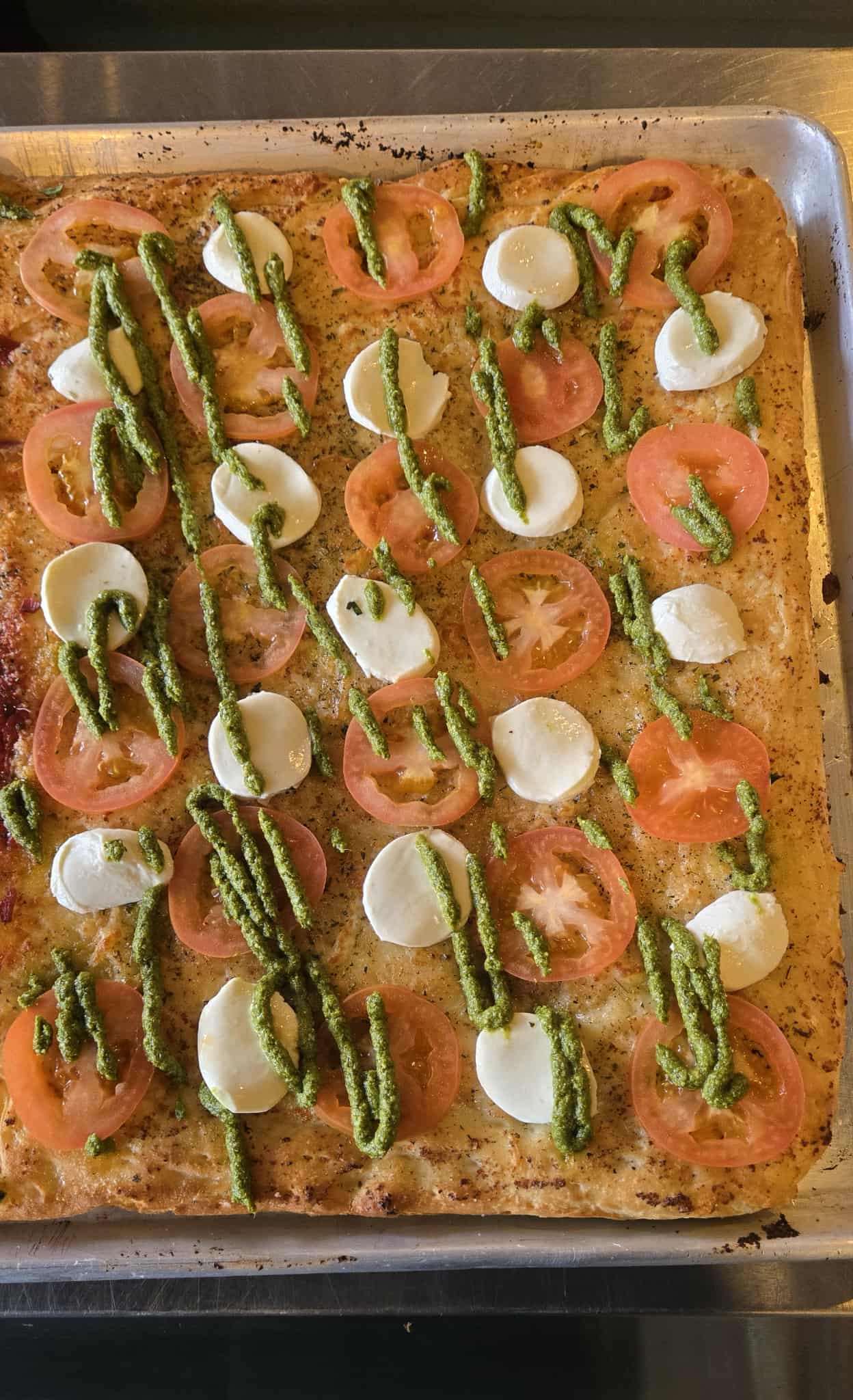 - Focaccia tomates fraîches, pesto et bocconcini.