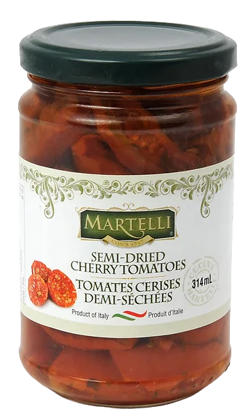Les tomates Demi-séchées à l’huile sont une spécialité du sud de l’Italie. Récoltées à la fin de l’été, elles sont lentement séchées au soleil ou au four pour être savourées durant les mois plus froids. Les tomates cerises Martelli, en particulier, sont exceptionnelles : ces petits trésors sucrés perdent leur eau au cours du processus traditionnel et développent une saveur intense, rehaussée par de l’ail, du basilic.
