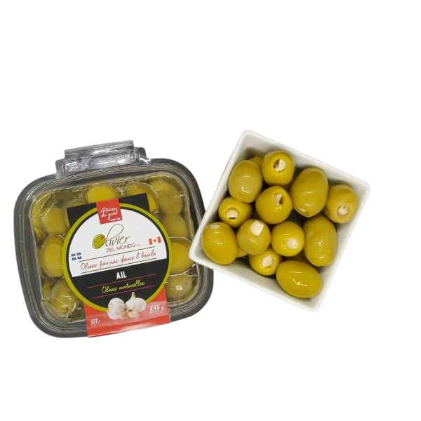 Olives farcies à l'ail : olives vertes, ail, huile de canola et sel.