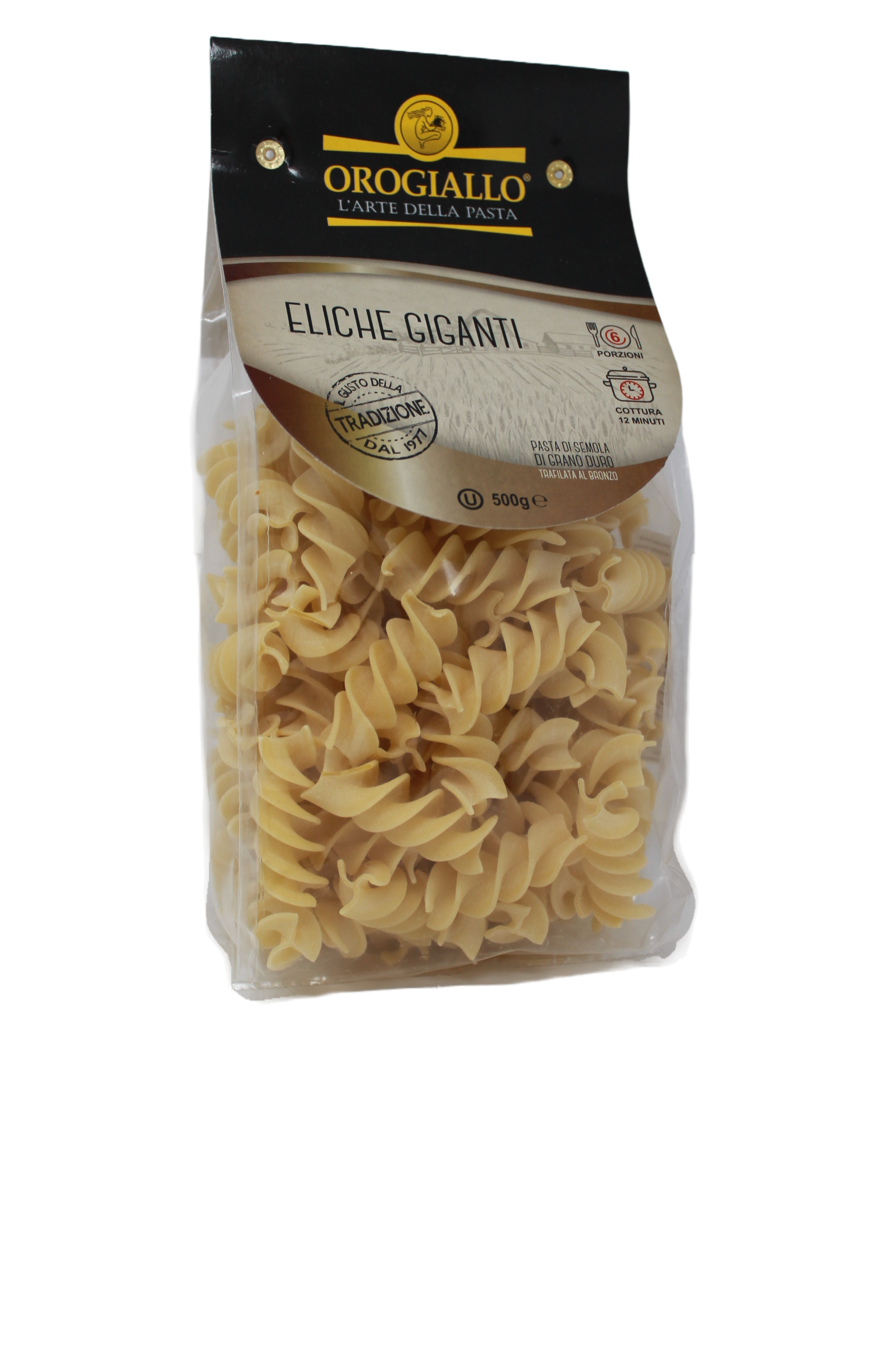 OroGiallo est produit exclusivement avec des grains soigneusement sélectionnés. Le produit final ne cuit pas trop, a une saveur et une couleur caractéristiques, est rugueux et se marie bien avec n'importe quel assaisonnement. Afin de conserver toutes les caractéristiques organoleptiques des pâtes fraîches, l'entreprise a personnalisé le processus de pasteurisation pour chaque format, donnant au produit une durée de vie de 120 jours ou de 60 pour les pâtes « très fraîches » et pour les garnitures sans ajout d'aucun conservateur ou additif. .