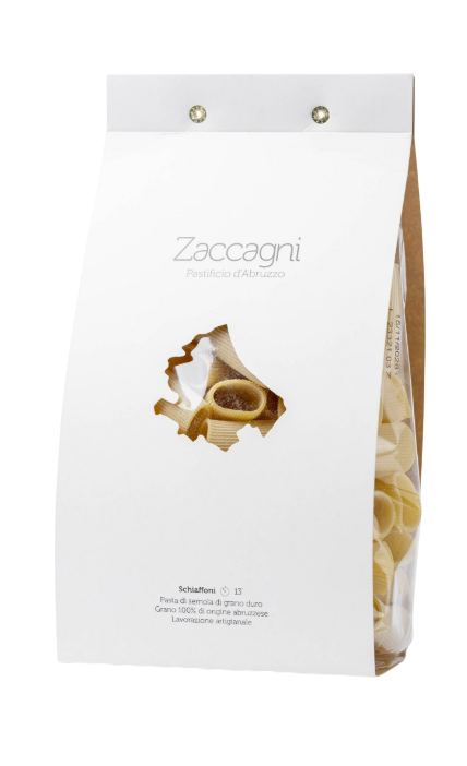 Les pâtes Schiaffoni Zaccagni sont fabriquées uniquement avec de la semoule de blé dur de la meilleure qualité et de l'eau pure de Majella. Le séchage lent et délicat à très basse température garantit un produit unique et précieux, parfait pour les tables et les restaurants du monde entier.