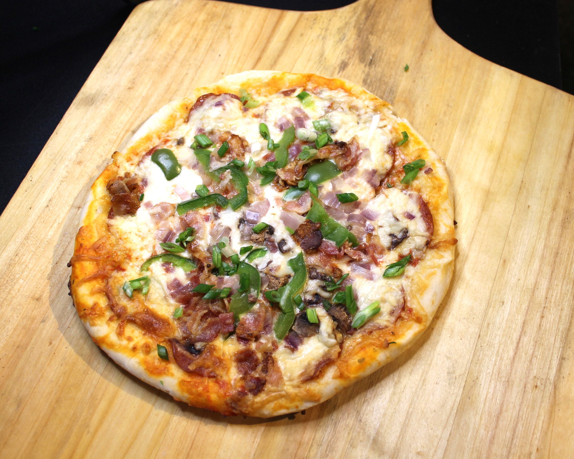 Une pizza artisanale croûte mince de luxe pour les plus grands amateurs de pizza italienne. Avec sauce à pizza Gio's, mozzarella, bacon, pepperoni, champignons, oignons rouges et poivrons.
