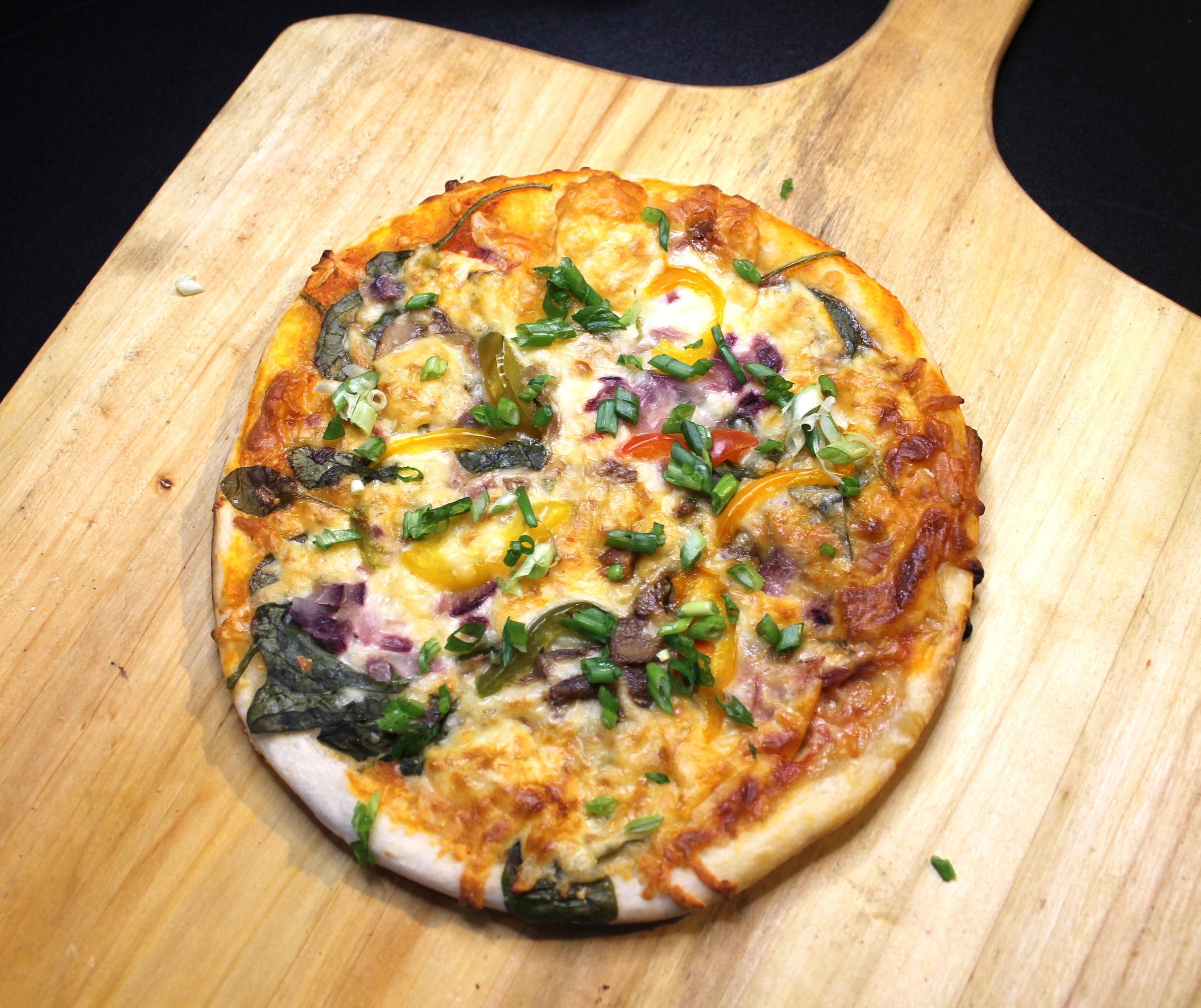 Pâte à pizza Gio's (farine de blé, eau, huile végétale, sucre, sel, levure), sauce à pizza Gio's (Tomates entières, bouillon de poulet, eau, huile végétale, fromage parmesan, oignon, sucre, basilic, ail, sel et poivre), fromage mozzarella, champignons, épinards, oignons, tomates et poivrons