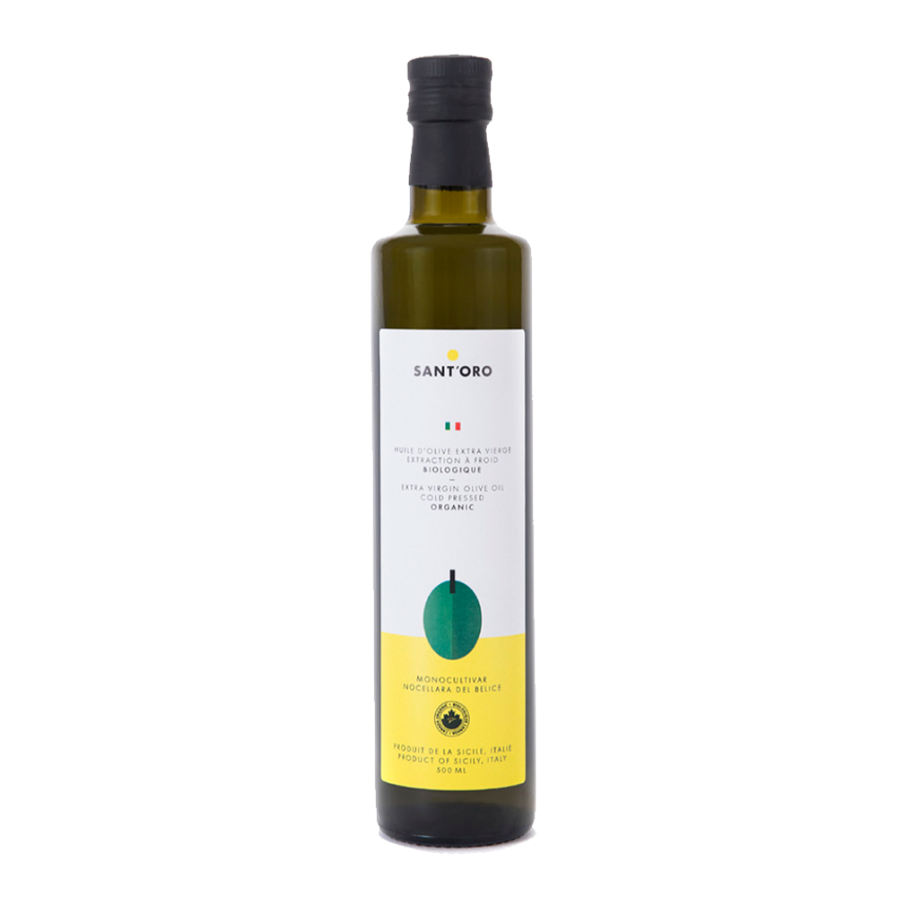 L'huile d’olive extra vierge biologique Sant'Oro est produite sur une ferme sicilienne située près de la mer Tyrrhénienne. Elle contient une seule variété d’olives provenant de la région de Castelvetrano, la Nocellara del Belice, reconnue pour son léger goût crémeux.